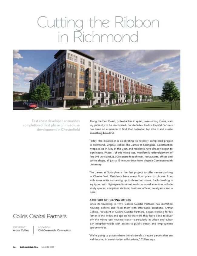 For over three generations, Collins has created value and profitability through strategic redevelopment and repositioning underutilized properties. Collins owns and operates a $200 million portfolio of mixed-use, multifamily and medical office buildings in the mid-Atlantic to New York City markets. The firm is nationally recognized for its redevelopment work in urban waterfronts, reemerging downtowns and brownfield sites especially well-known for its public-private ventures. Collins also owns a portfolio of workforce housing projects as value-add investments near employment centers and higher education and medical markets.